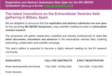 Read MoreTERAV-ISCIII (Red Española de Terapias AVanzadas) is organizing together with Geivex a course on biomedical uses of EV and Nanoparticles as Advanced Therapies in Valencia. The course is supprted by the cathedras of Thechnological Development and Exobiopharma of Nanomedicine from University of Zaragoza. The event will take place the 11th and the 12th of March […]