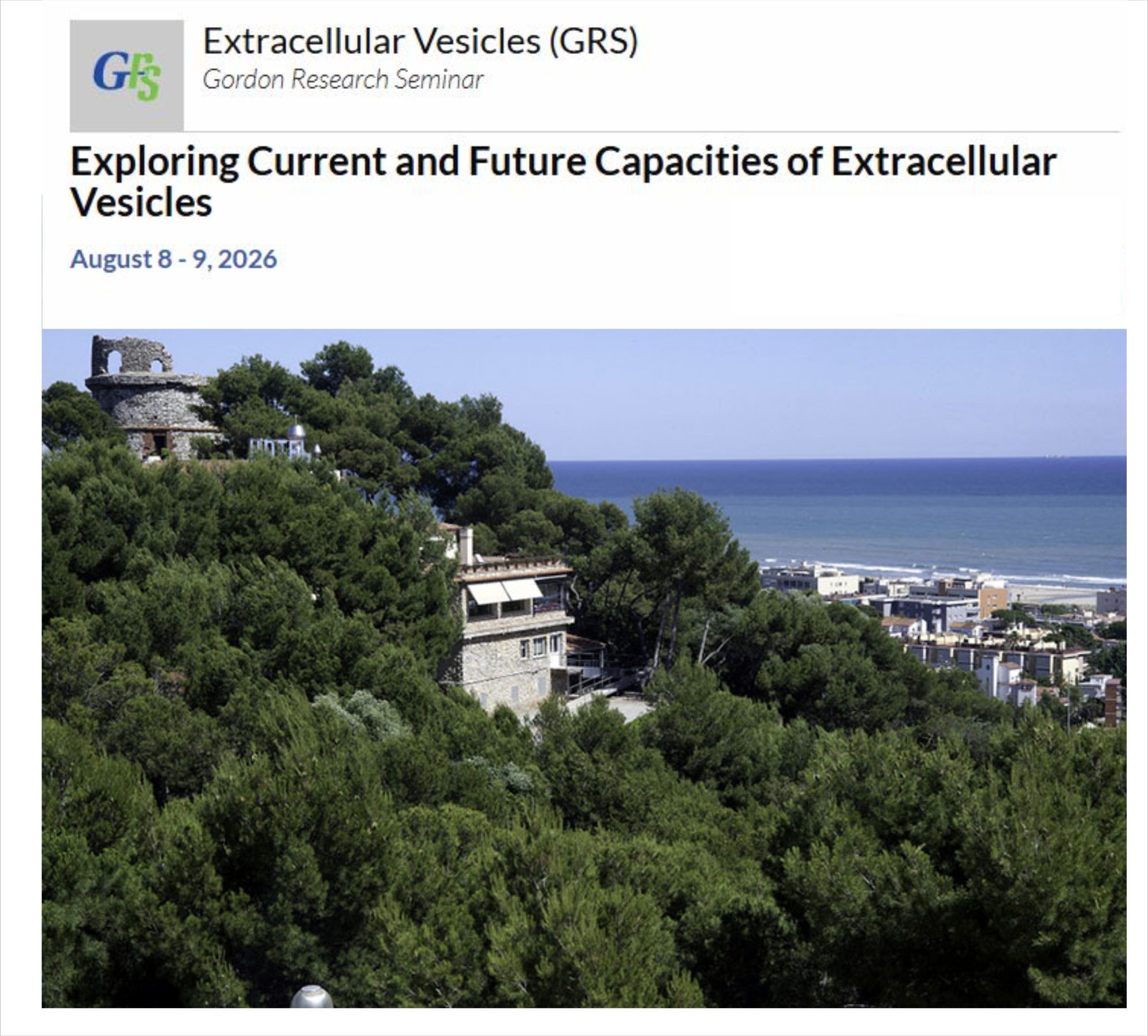 We are happy to announce the Gordon Research Seminar (GRS) “Exploring Current and Future Capacities of Extracellular Vesicles”, taking place August 8–9, 2026 in Castelldefels (Barcelona), Spain, at the Rey Don Jaime Grand Hotel.